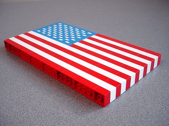 | The flag is 2 studs thick. It didn't take me long to make this decision, as I am certain I don't have the right pieces to finish a 1-stud-thick version. It is also much stronger than it would be at 1 stud. You can see a couple of scuffed bricks here- I was in a hurry and didn't get to examine the parts as carefully as I would have liked. I'll take it home over the weekend and pick out some nicer bricks. As for the scuffed plates, I'm waiting for a BrickBay order to come in... | |