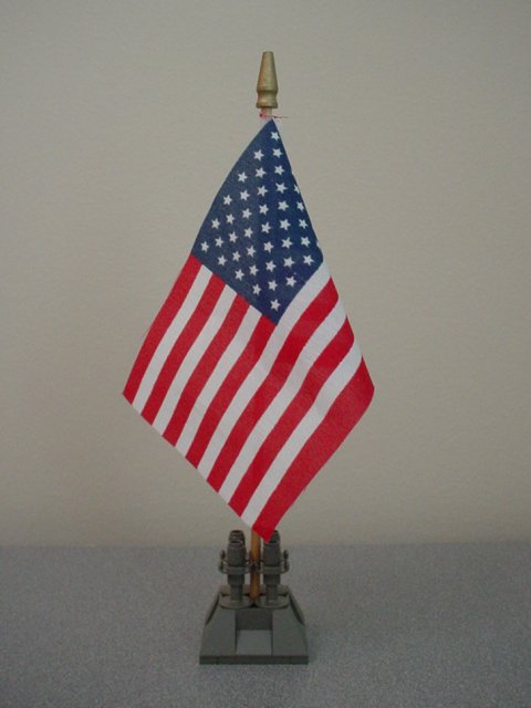 Here is the stand, holding up a little cloth flag. The wooden dowel is almost exactly the same diameter as a stud, fitting snugly but not binding.