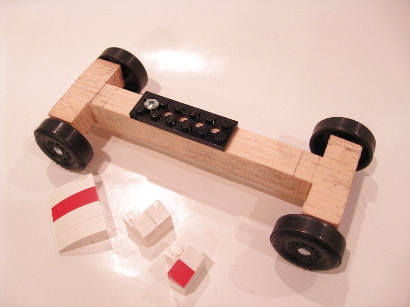 | No Lego pieces were harmed in the building of this car. The screw is lightly attached through the hole in the Technic plate and keeps the body from lifting off. The fit of the body around the wooden frame is snug enough to prevent shifting/twisting in any other direction. | |