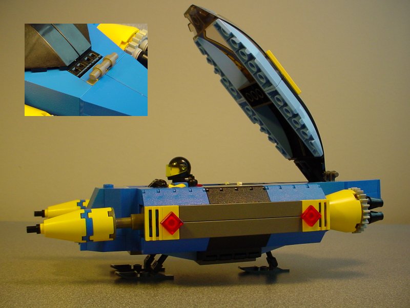 The canopy hinges upwards (all 16 studs long of it!). The hinges are mounted flush with the top surface- the inset image shows that area with the canopy closed.