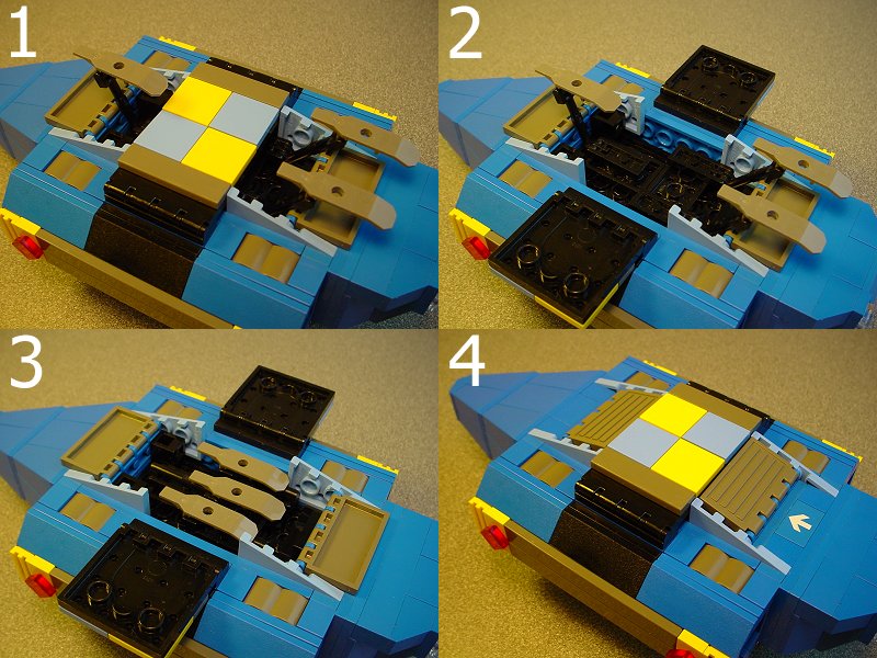 | I'm no expert with landing gear. I built in huge doors to fit them in, thinking that I would have tons of left over space... (space!) But then I was barely able to fit in something that worked. At least it's solid- the legs brace against the frame and it stands very sturdily. Note how slick the bottom is as well- no studs or bottom surfaces of plates. | |
