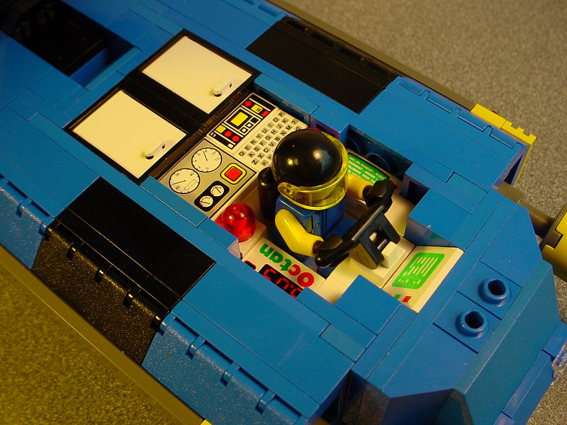 | The cockpit interior is fairly large, but filled with equipment. The mounting of the handle bars is weirder than it first looks- that's a 1x2 tech plate with a half pin holding the clip. Putting this on the floor studs-up would have left a gap in front of the front display. And I added two studs SNOTted in at the nose so that the canopy wouldn't flop open. The whole body is kept together by a mess of 1x4 bricks with side studs. | |