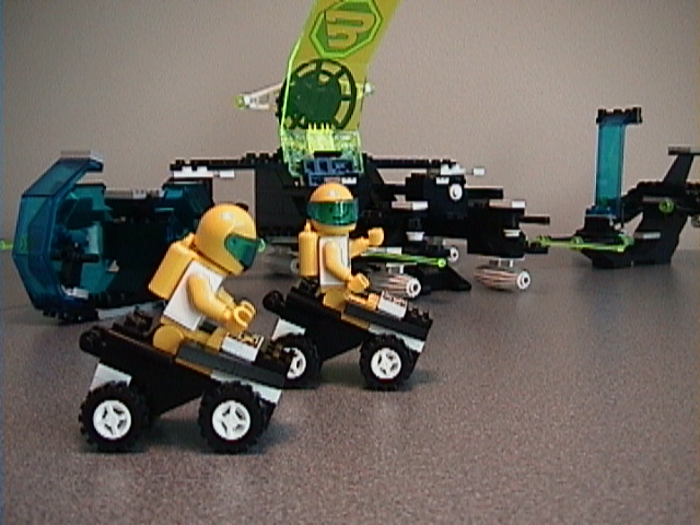 | The operative, safely home, celebrates along with his partner by taking a spin in the ground vehicles carried in the Aerial Intruder. His partner played the key role of piloting the escorting vessel- a stolen Message Interceptor, visible on the right. | |