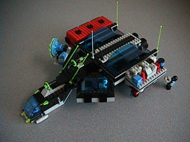 Here is the ship with a variation of cargo modules: two flatbed modules, a stasis pod, a portable radar device, and a large sealed case. An android is reattaching a small canister to one of the flatbeds.