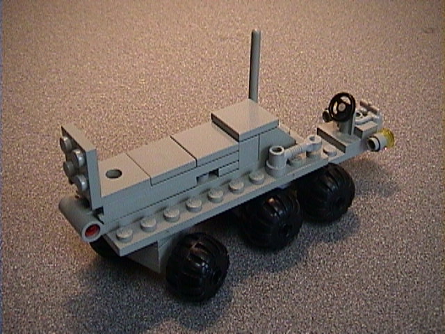 | Note that when the launcher is down all the way, there is a tile at the front that prevents the ship from sliding off that end during ground transport. Note also the pivoting rear wheel assembly. Although it makes it awkward to push the model backwards, this looks really cool when you push it around on squiggly terrain. | |