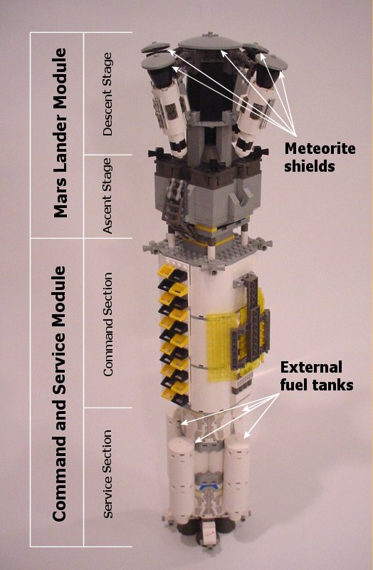 On the nose of the ship (the top in this picture), is the Mars Lander Module (MLM). It is attached upside-down to the rest of the ship, and has big round meteorite shields covering the bottom (leading) surface. The rest of the ship is the Command and Service Module. The top half of that is the Command section, housing the astronauts' living space. The bottom half is the Service section, with the engines and various bits of machinery such as life-support, gyros, and energy cells. Four external fuel tanks are also attached to the Service section.