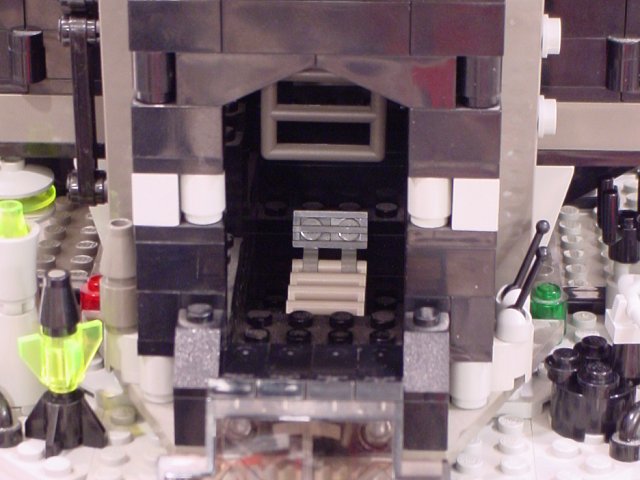 This is the rear of the ship, on the next level down. The ladder at the top of the picture leads to the bridge, and the ladder on the floor is mounted on the hatch that leads downward to the living quarters (the octagonal deck). On the other side of the floor hatch is another door that leads to the docking bay for Azrael. On both sides (hidden from view) of the floor hatch are doorways to the small upper cargo areas.