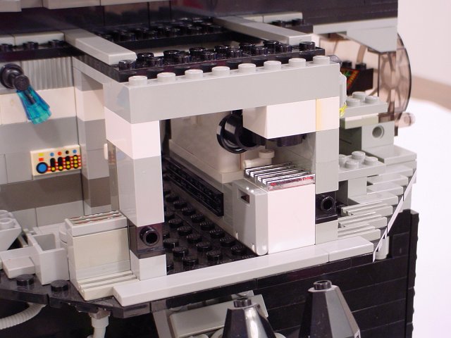 The kitchen has a range, oven, sink, and fridge. There's also a hanging pot rack, and you can see some of the cooking utensils above the sink. Probably not practical on a space ship, but it looks cool.