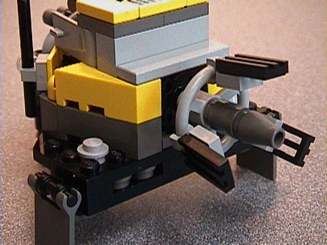 | One of the first things to go was the stock rocket engine with a simple exhaust port. It has been replaced with this little beauty, featuring thrust vanes and a much longer fuel expansion chamber. You can see the exposed side of the improved fuel cells on the left rear, near the bottom. There are another two fuel cells on the other side, obscured by the thruster here. | |
