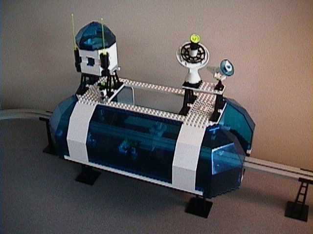 | This shows the whole terminal, as seen from the "display" side. The other side is open to give access to the monorail reverser control. I also made a pair of big ramps for the minifigs to get in and out, but I didn't have them with me when I took the pictures. | |