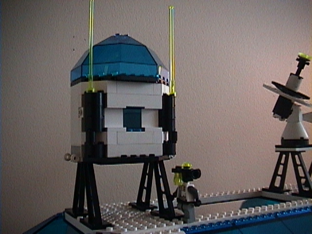An alien Exploriens tech is seen walking around on the top of the station. Here he is approaching the control tower for inspection. The main long-range comm beacon is at the extreme right.