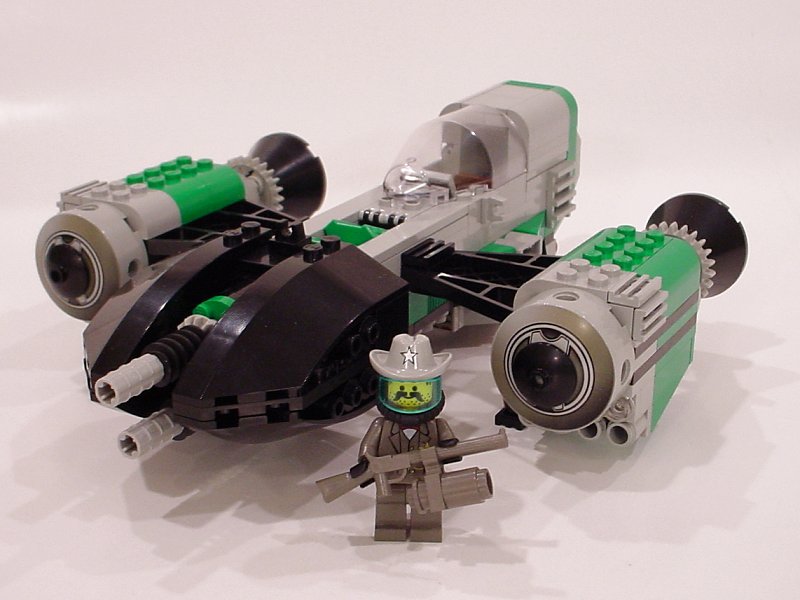 Garrett carries a blaster rifle with a built-in grenade launcher mounted below the barrel.