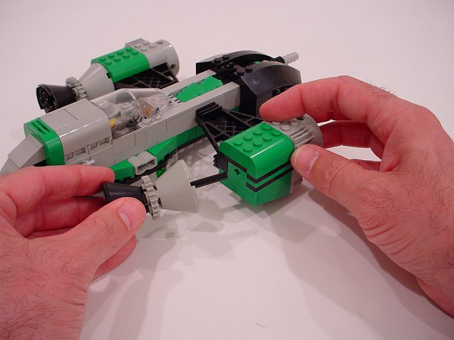 A Technic axle runs through the cones and gear at the rear of the engine, and is attached to the engine body through 1x2 bricks with axle holes. The nose of the engine is attached the same way.