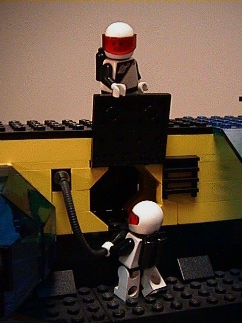 Two of the crew are seen here performing routine maintenance work through the port hatch.