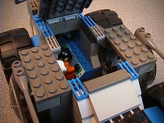 This model has been equipped with a pair of tactical workstations in the rear area. A crewman is operating one of the stations. His helmet, just visible at the left edge of the opening, hangs from a rack on the wall.