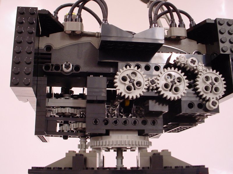 On the right here is some pretty slick gearing, which I couldn't have done without the help of David Wegmuller. I use the right motor output for two different functions. The little piece on the top right of those gears is the key here. When it turns one way, it drives the elevation mechanism (which is currently engaged). When it turns the other way, the block rotates and engages the firing mechanism instead. On the left is the rotation mechanism, with a shaft coming down from the motor on the far side of the Mana. It drives a set of gears which end with the tiny gear hanging off the bottom driving the outer teeth of the big turntable. |