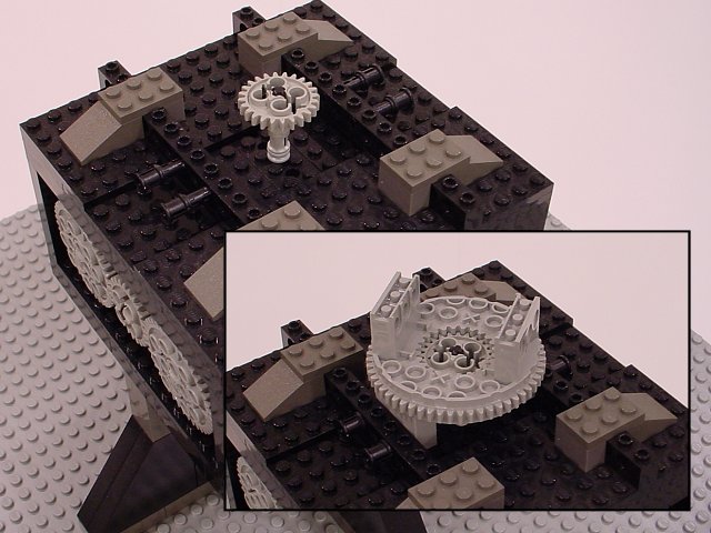 | This is the roof with the turret removed. It has to be easily removeable for transport, because it's fairly tall and awfully top-heavy. The gear sticking out the roof drives the gears on the side of the base. The inset picture shows how the turret's turntable fits on top. Note the pins that push through the Technic bricks to lock in the turntable. | |