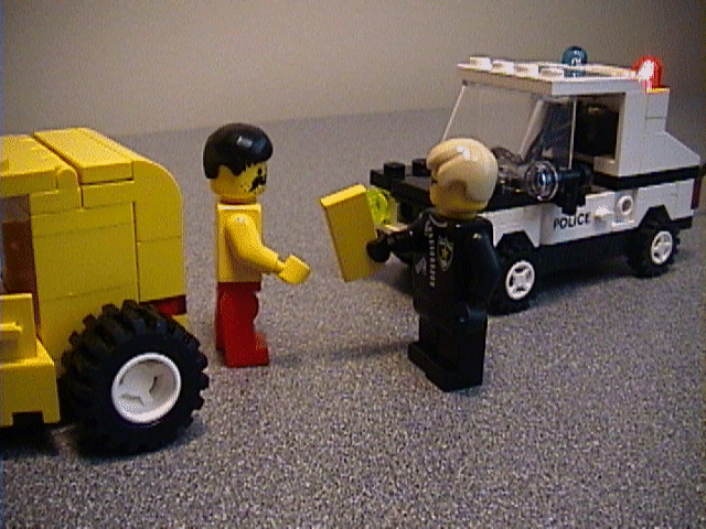 BUSTED! Note that the cop car model's lights are actually flashing- you can see the wire if you look closely at the rear interior area and the extreme right edge of the picture. I took two pictures at different times in the cycle and stitched them into an animation. |