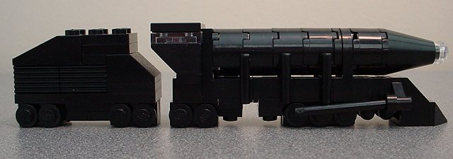 | The locomotive and tender together are 18 studs long, leaving a one-stud space empty in between for the coupler spacing. This picture shows the leading truck better than any other shot. I really wanted wheels that were smaller than the drivers, but unfortunately I couldn't get the offset right to bring them closer to the track. | |