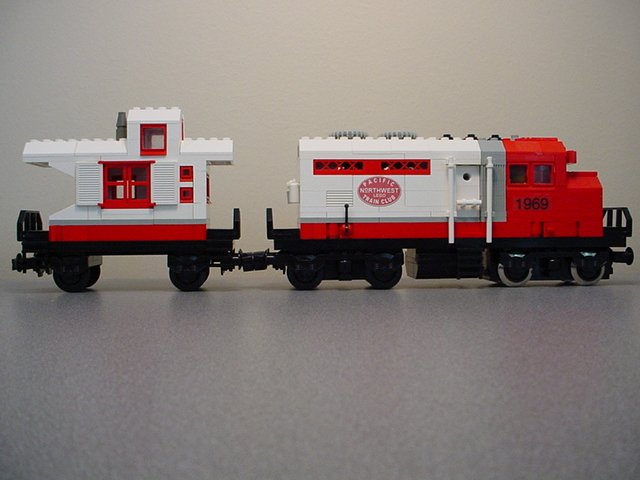 | Here the caboose appears with the matching locomotive. The coloration and geometry match up just right, but the somewhat modern locomotive (late 60's/early 70's) seems stylistically rather out of place with the caboose. That's alright, though- I still like 'em together. | |