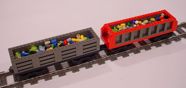 The ugly red car is almost the same design as the regular gondolas, just with different slopes on the ends. The dark grey one here uses sliding rail bricks.