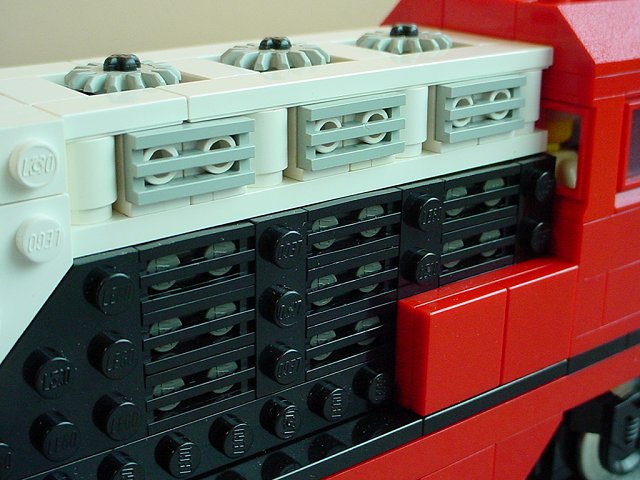 | There are a ton of vents on the rear sides, and each vertical set lines up with a fan on the top. No, the fans don't turn on this model. Note that the top grills (light grey) are actually in the same plane as the black ones below- the upper white section is set a half plate back from the black surface, and the grey vents stick a half plate back outward. There are dark grey plates behind the lower vents to help them stand out. | |