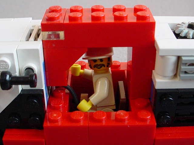 | I was in a major rush and didn't have time to finish the interior, and I am saddened that I couldn't find a better way to route lighting power through the cab area. I may at least replace the front inverse slope with a blue computer panel and add in a control stick or two. On the bright side, at least there's a brown leather seat! | |