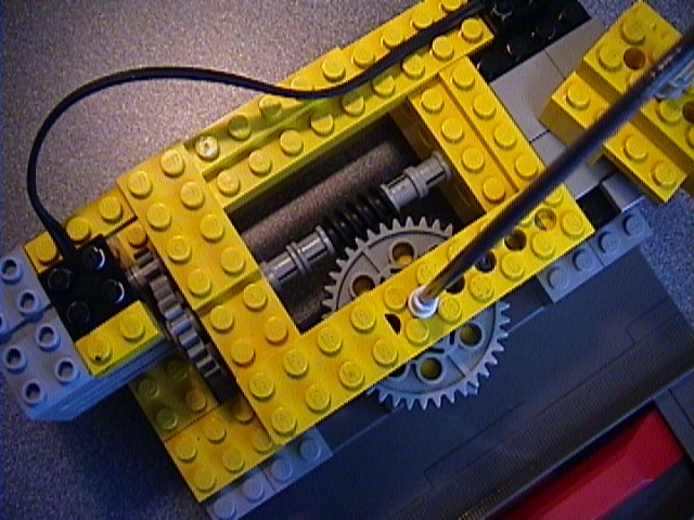 The gearing itself is very simple- with the 2x6 plate removed from above the motor, you can see all the gears from above. There is a small 8-tooth gear on the motor shaft that engages a 24-tooth gear. That gear shares a shaft with a worm (screw) gear. The worm gear engages the big 40-tooth gear that is attached to the top of the control. There is plenty of torque to turn the control, with a 120:1 gear ratio from the motor. It takes about 15 seconds to rotate a full 360 degrees, which gives a rough estimate of 480 RPM as the speed of the Technic motor.
