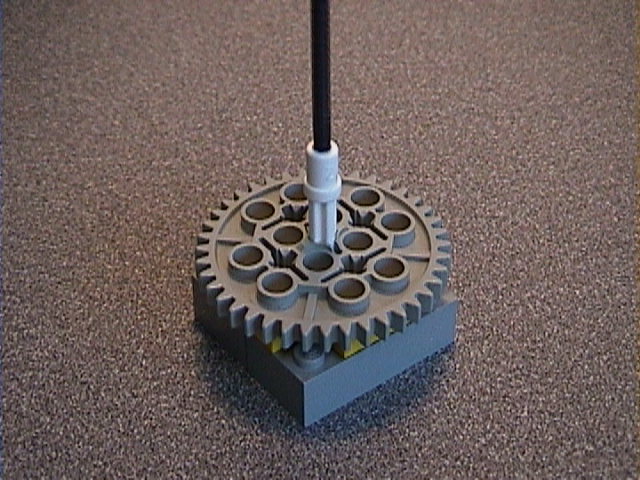 | This is the assembly that fits on top of the rotating duplo control. Since the studs are double-sized, you have to have to use 2xn bricks as the primary interface between Lego and Duplo. This assembly has a pair of 2x4 bricks with a couple of plates on top and a big gear set onto the plates. A worm gear (not shown) engages the big gear, and the Znap flex shaft fits through the holes in some 2xn Technic plates (not shown) above the gear. | |
