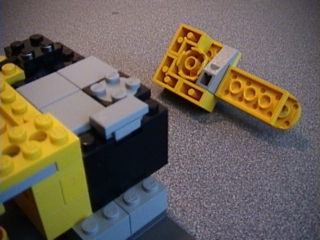 This shot details the workings of the control lever. The lever has been removed and set on the table next to the machine. There are tiles on the top of the battery box and its switch to keep the underside of the lever moving smoothly. These also prevent the button from getting locked into the "stay on" position. The lever is shaped so that as it turns, the inverse slope piece gently pushes the button down. Through most of the rotation, the bricks around the center piece keep the button down. The gap after the last brick is just big enough to allow the button to release, and is positioned to do so when the lever is ready to engage the train again. The round 2x2 is necessary because otherwise its corner in the open area would prevent the button from releasing.